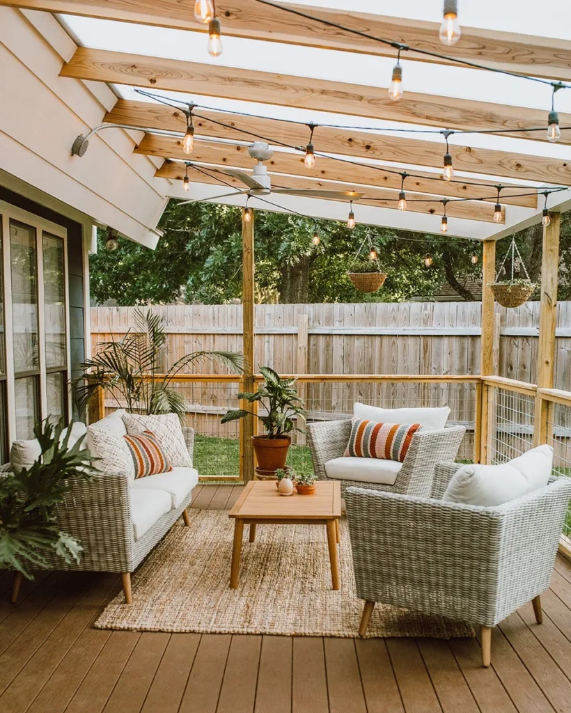 This area screams cozy boho! I tried layering a rug, rattan furniture, and neutral cushions in my backyard—it works wonders.