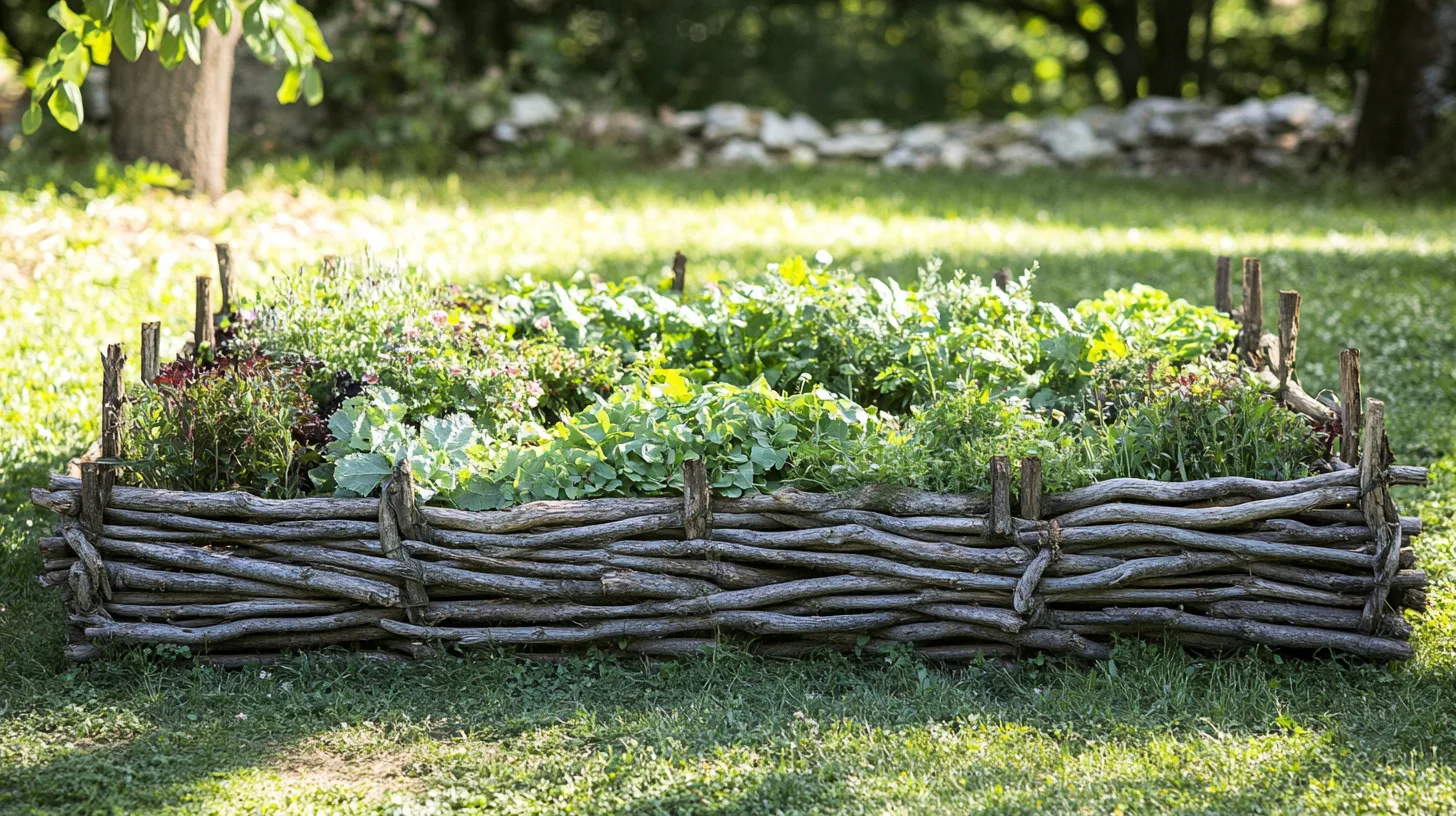 After trimming some trees, I kept the logs and used them as natural borders for my raised beds. No cutting or sanding, just stacked them up.