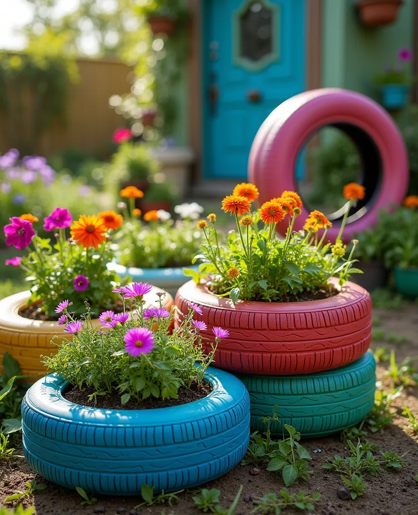 Recycled garden décor is so satisfying! I painted old tires in bright colors and turned them into quirky planters, it instantly livened up my space.