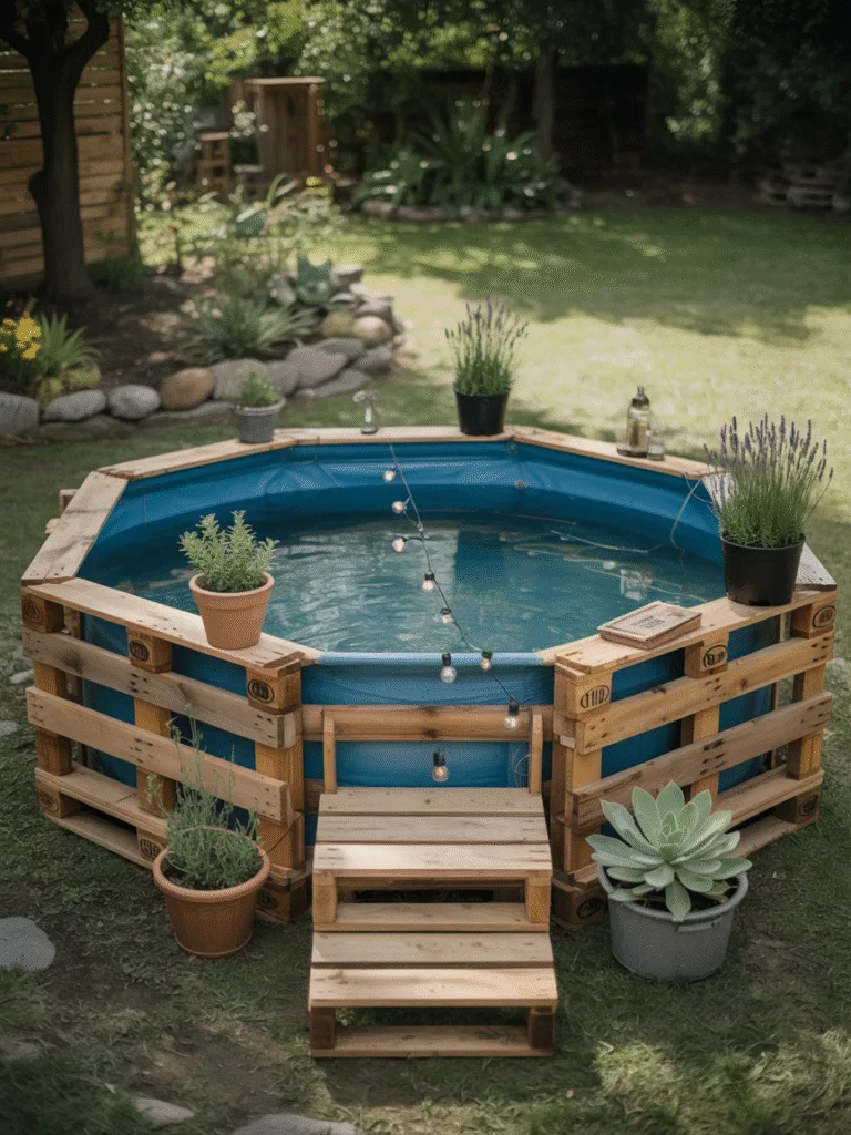A DIY pallet pool is built by arranging wooden pallets into a circle or square, lining them with tarp or a pool liner, and filling with water. Yep, it’s as clever as it sounds.