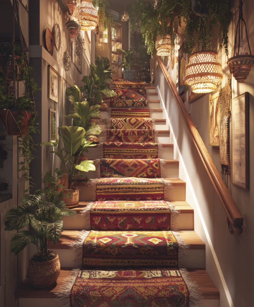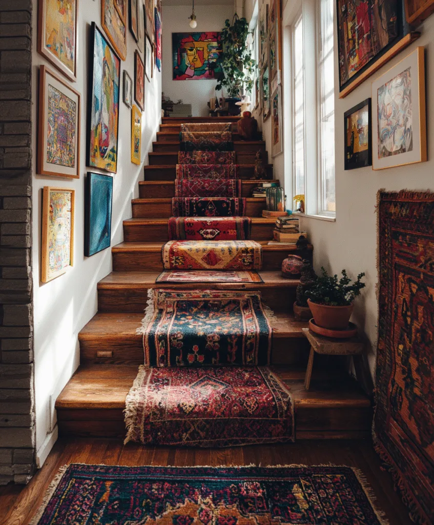 Ready for a fun DIY look? Try layering overlapping vintage or boho rugs going up your stairs. Yes, it takes work, but the payoff is a truly unique setup.