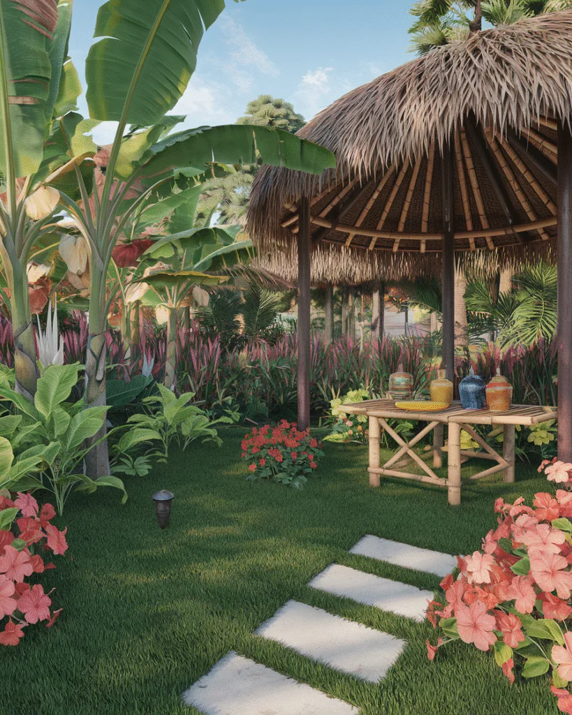 - Use lush plants like palms, hibiscus, and bird of paradise.