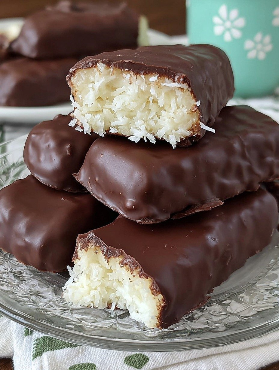 These look like a vegan Bounty-style bar—creamy coconut inside with a rich chocolate shell. The good news? You can make them healthier, higher-protein, and just as indulgent at home 💪🍫