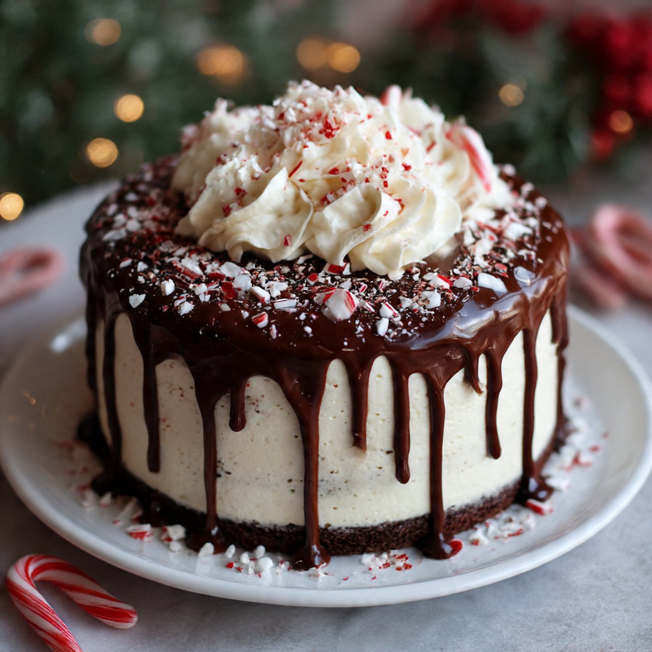 Moist chocolate cake infused with espresso, layered with creamy dairy-free frosting, finished with a glossy chocolate drip and crushed peppermint—this cake is pure winter magic.