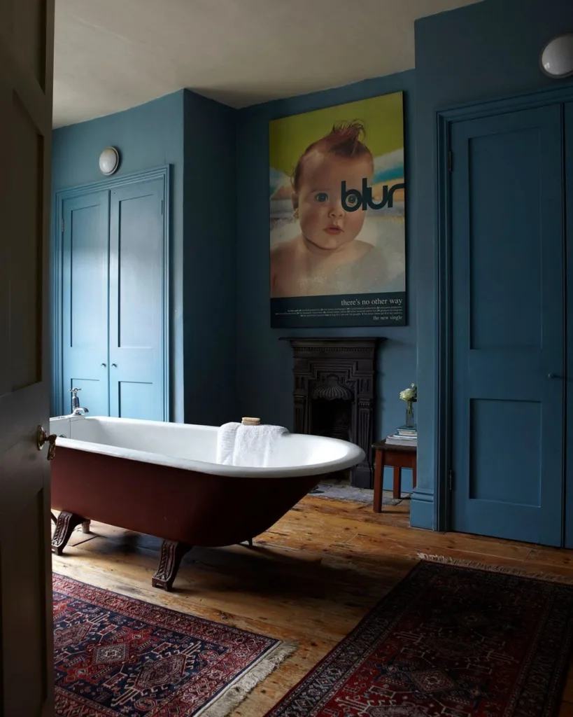 The vintage rugs here add warmth and pattern, tying the room together and softening the bold color choice. It’s such a smart way to create balance.