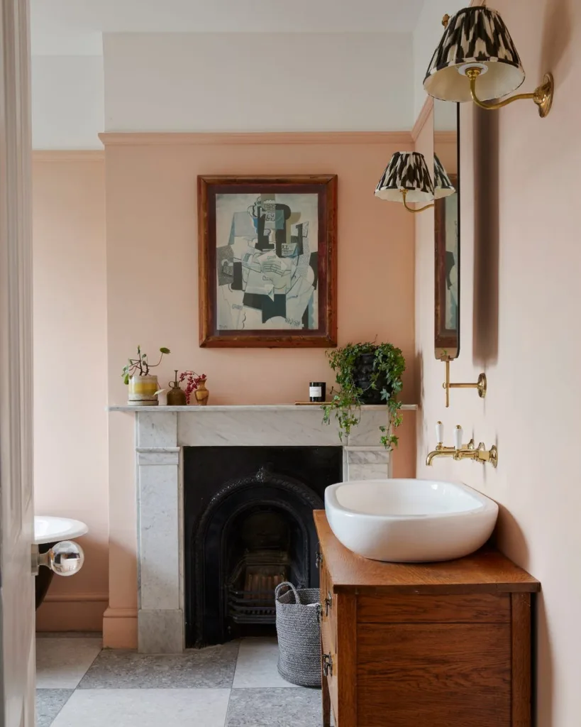 Sometimes you just want a soft touch of Victorian inspiration — and this bathroom nails it. The peachy walls set a calming, romantic tone without being loud or busy.