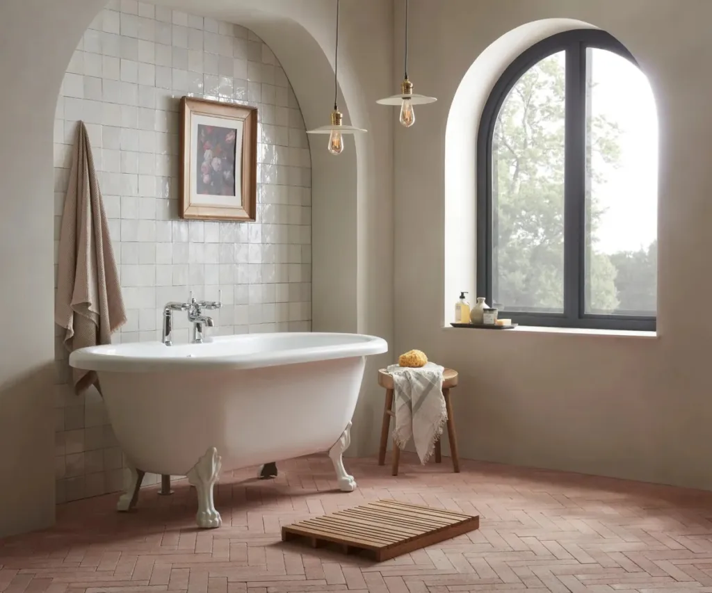 There’s a coziness to soft red terracotta tiles that you can’t ignore. They create a warm, grounded feeling, perfect for balancing a clean, elegant bathroom like this.